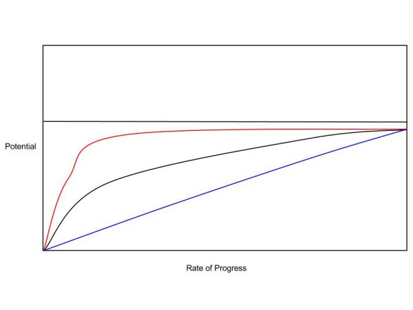 So we have a strength potential and, by extension, a mass potential. This potential is reached asymptotically, with a more aggressive slope corresponding with an increased potential for injury. It looks like this: