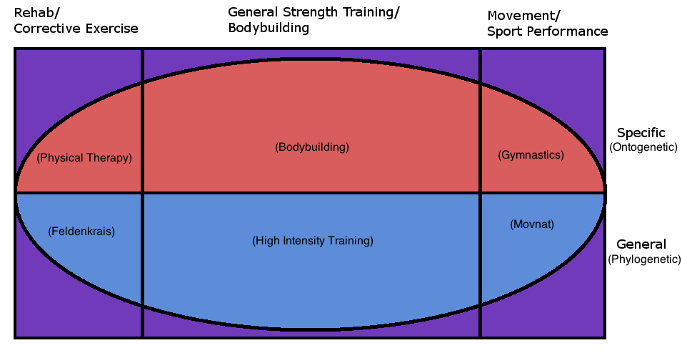 So one of the things I’ve done is expanded the “general” section because there is more leeway in avoiding creating dysfunction or injury when your movements are biomechanically congruent. Second I expanded the purple dysfunction areas to be larger when specializing or rehabilitating, as the more specialized you become the greater your risk of injury. It seems funny to “specialize” in general movements or movement patterns, but you can. This is seen a lot in the HIT crowd where the range of motion that is best loaded (from a force output perspective) is the “only” range of motion that these people venture. Stretching and mobility are dirty words; however if you can’t get into that range of motion voluntarily, and you have to venture there for some reason in real life, you’ll end up injured. Again, this is what I referred to in the first post as improving your boundary conditions and if you’re a HIT practitioner it would be wise to spend a little time here each week.